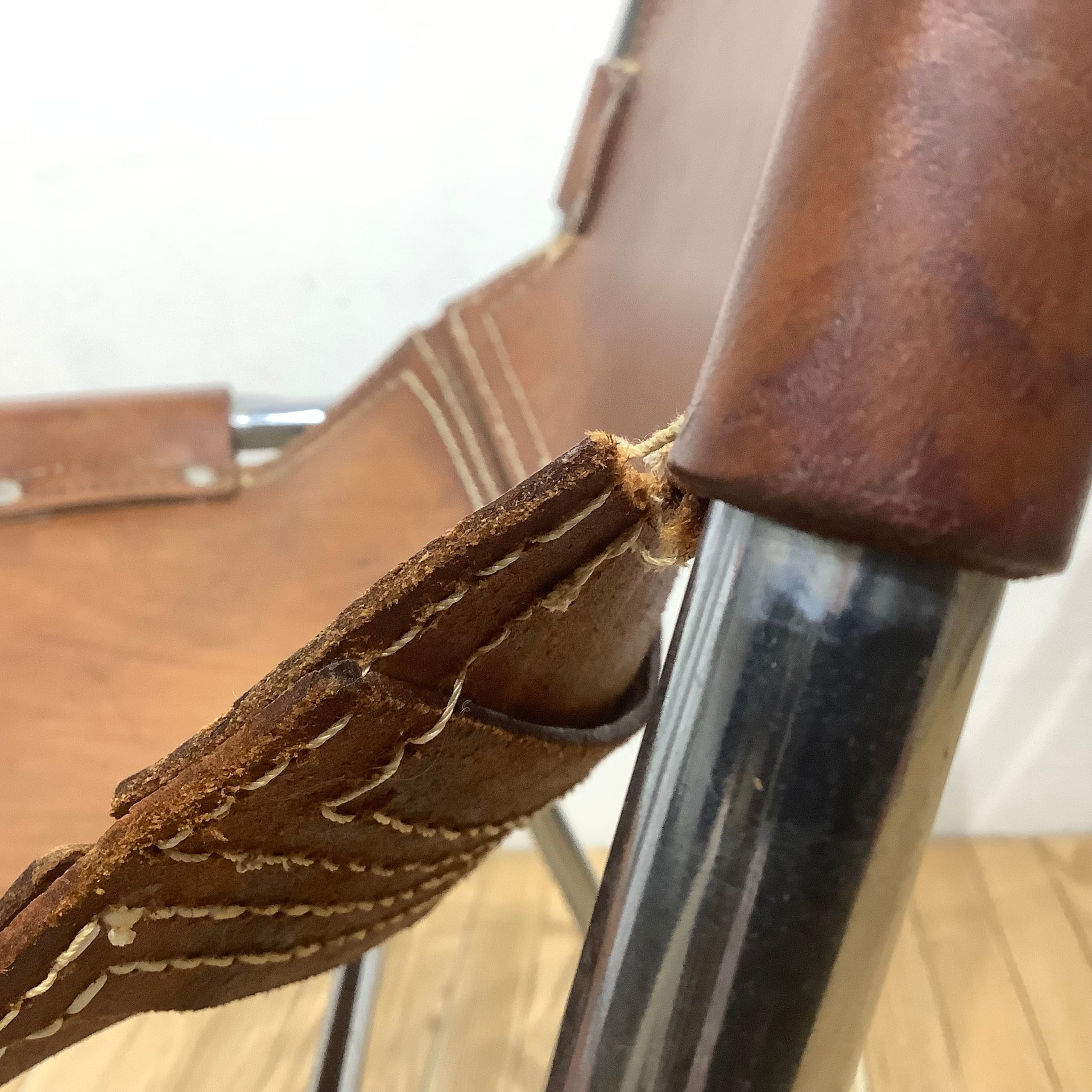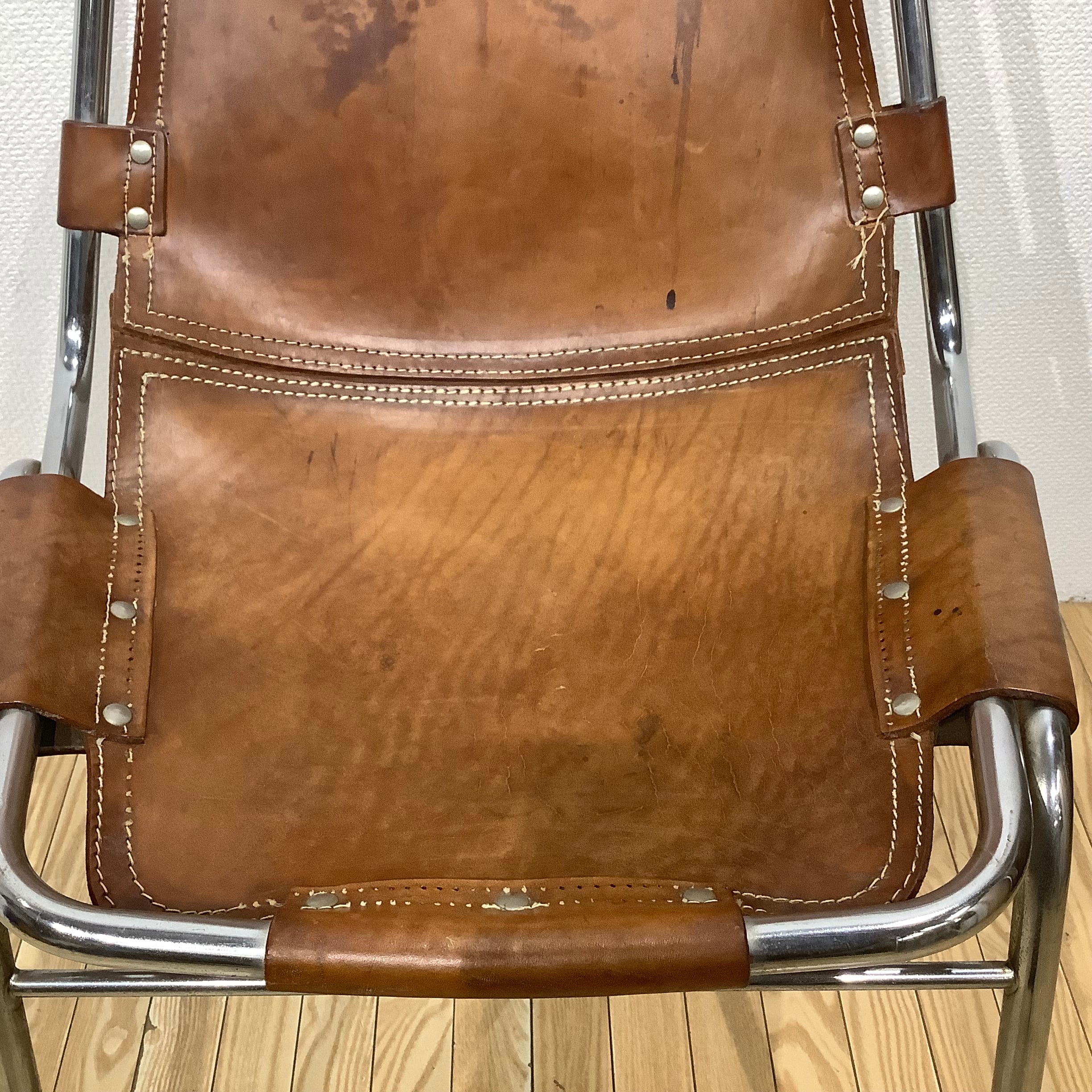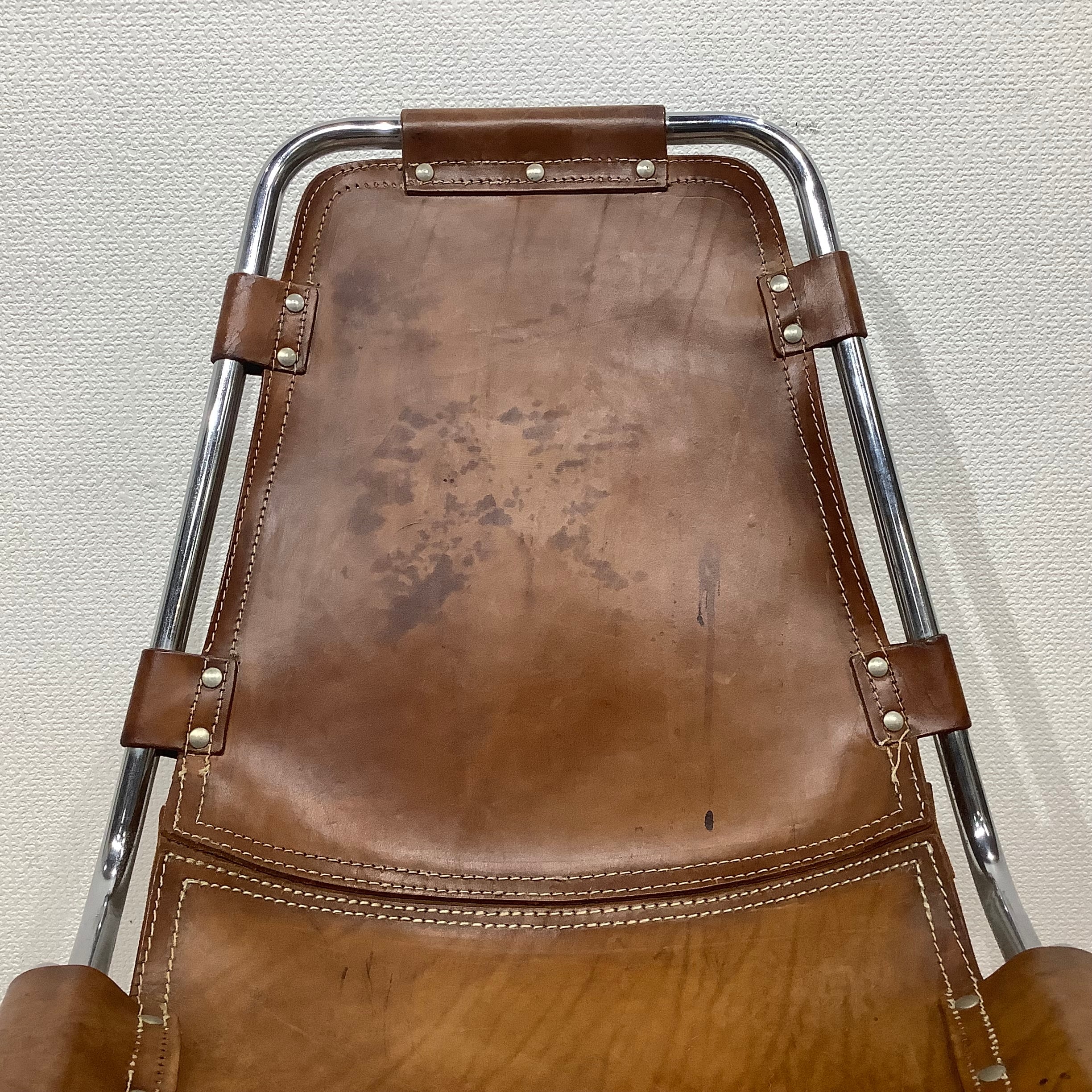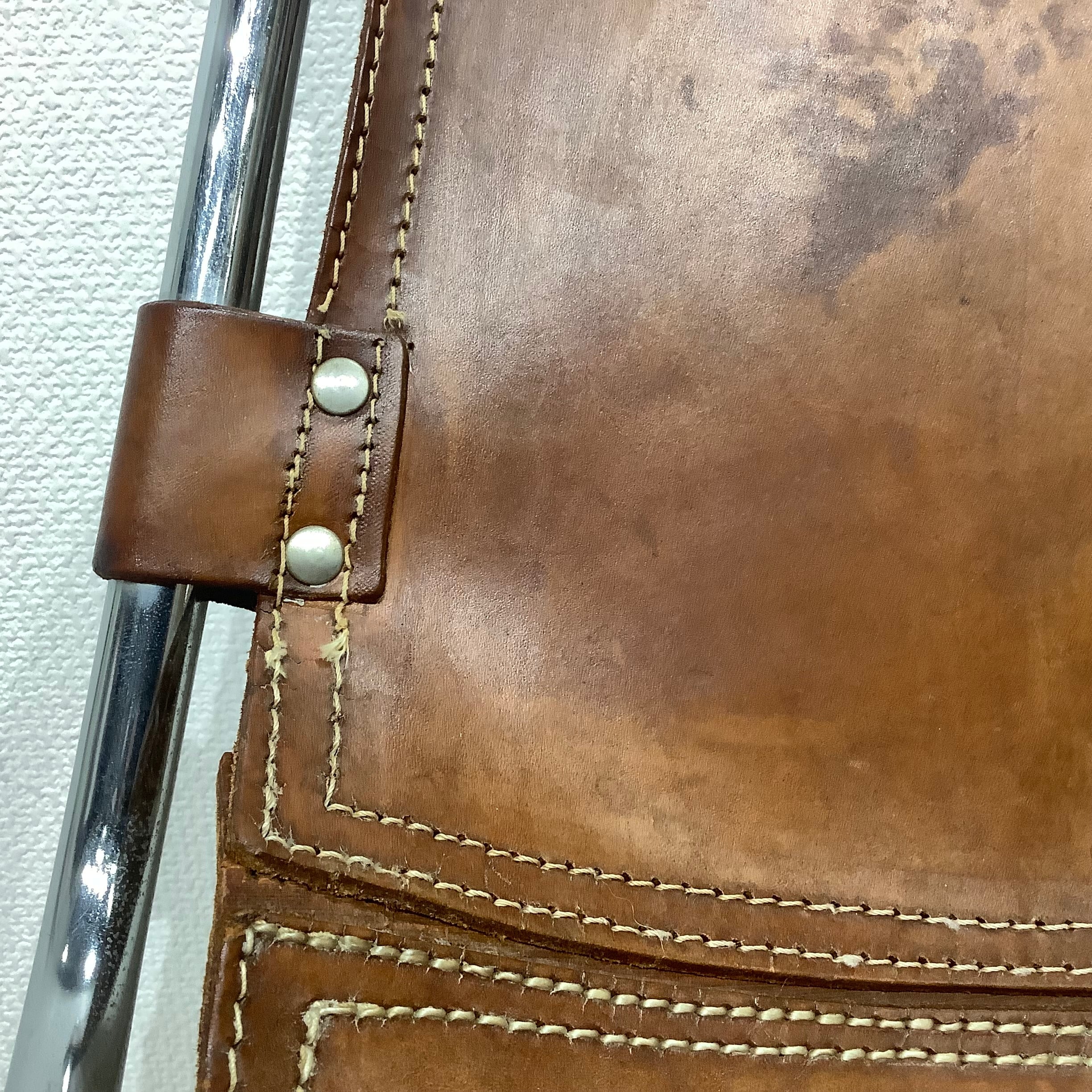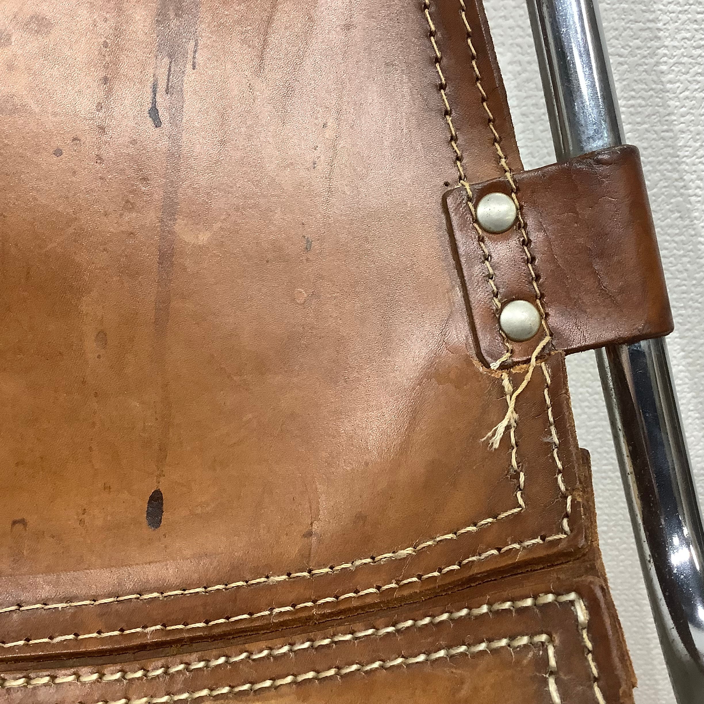 ヴィンテージ製品ゆえ経年変化によりレザー部分のシミやステッチにほつれや破れがみられるのとフレームに歪みがあります。
