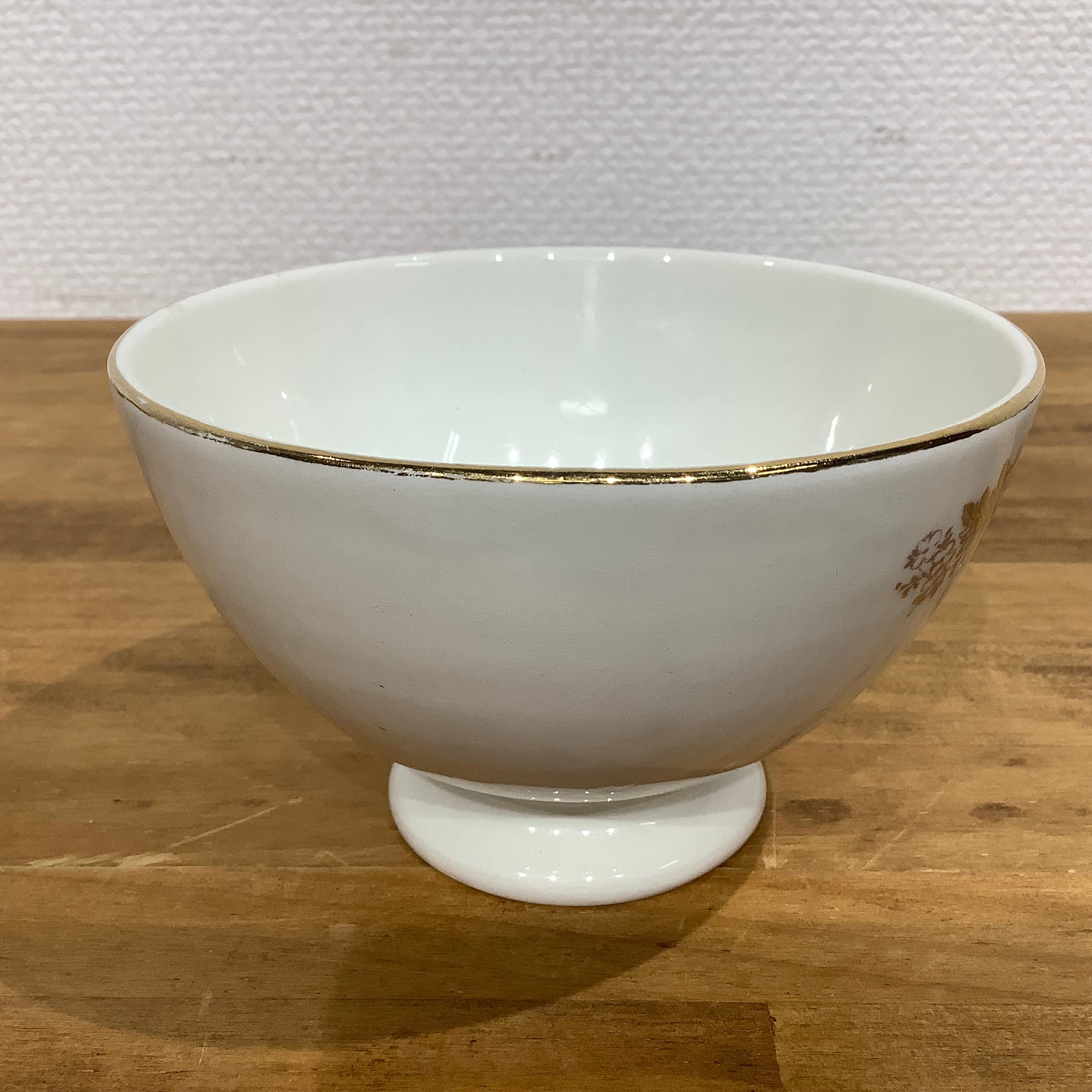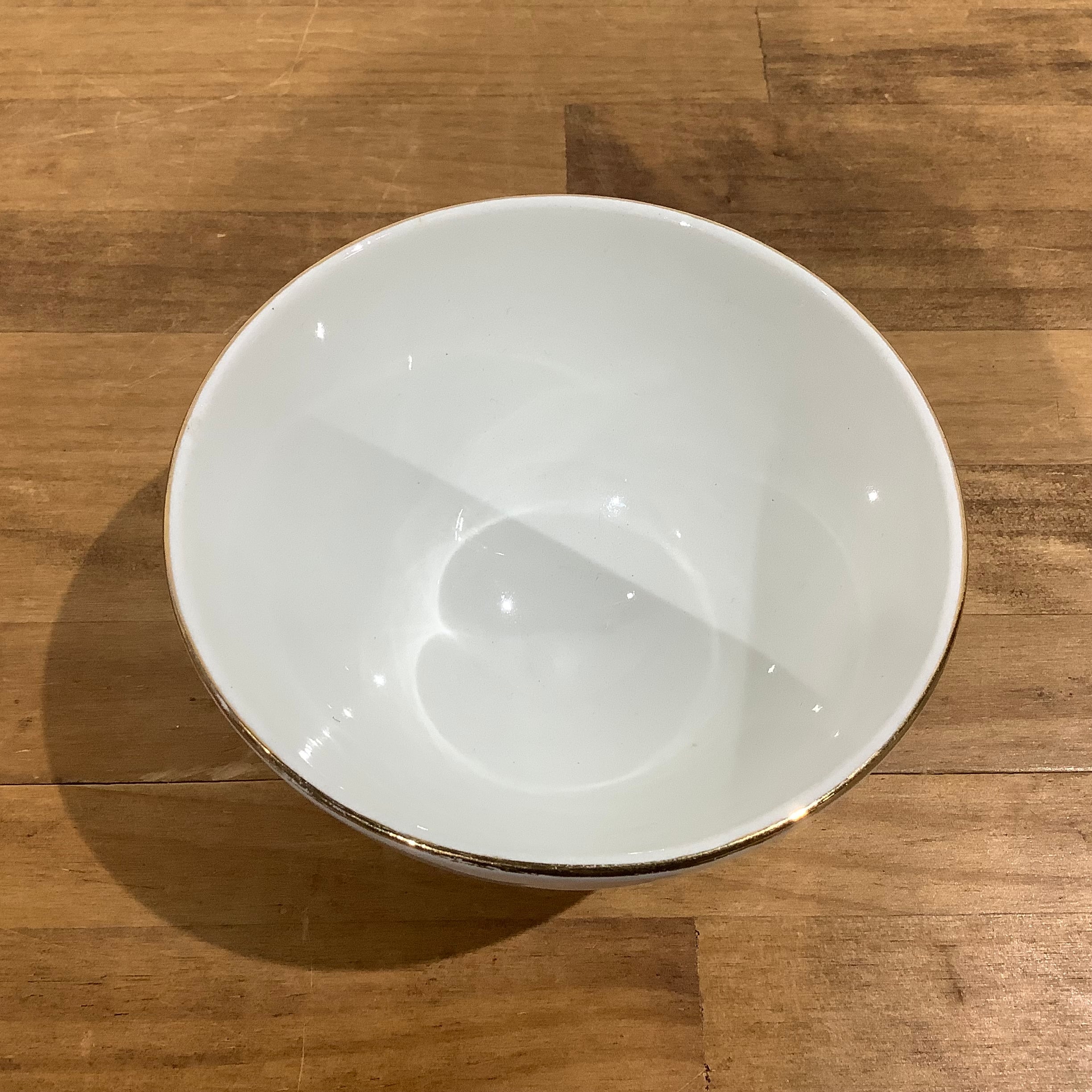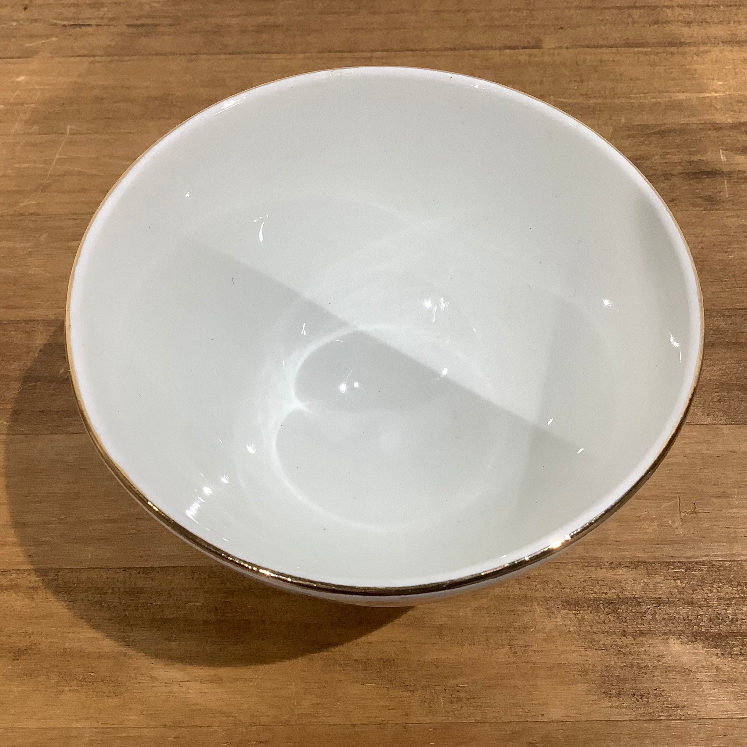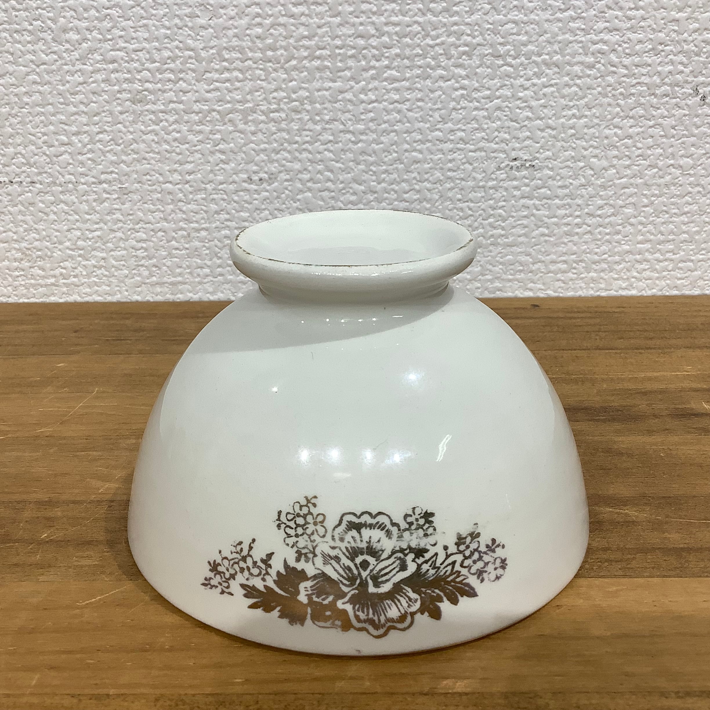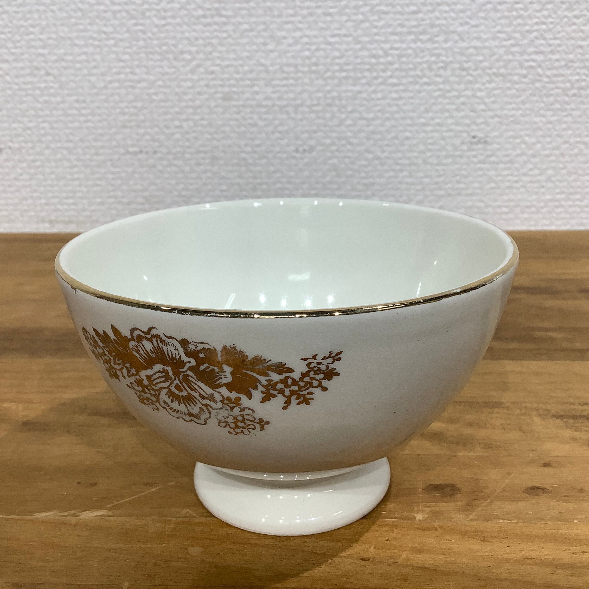 金色のビオラの花と口縁にラインがプリントされているアンティークのカフェボウルです。
