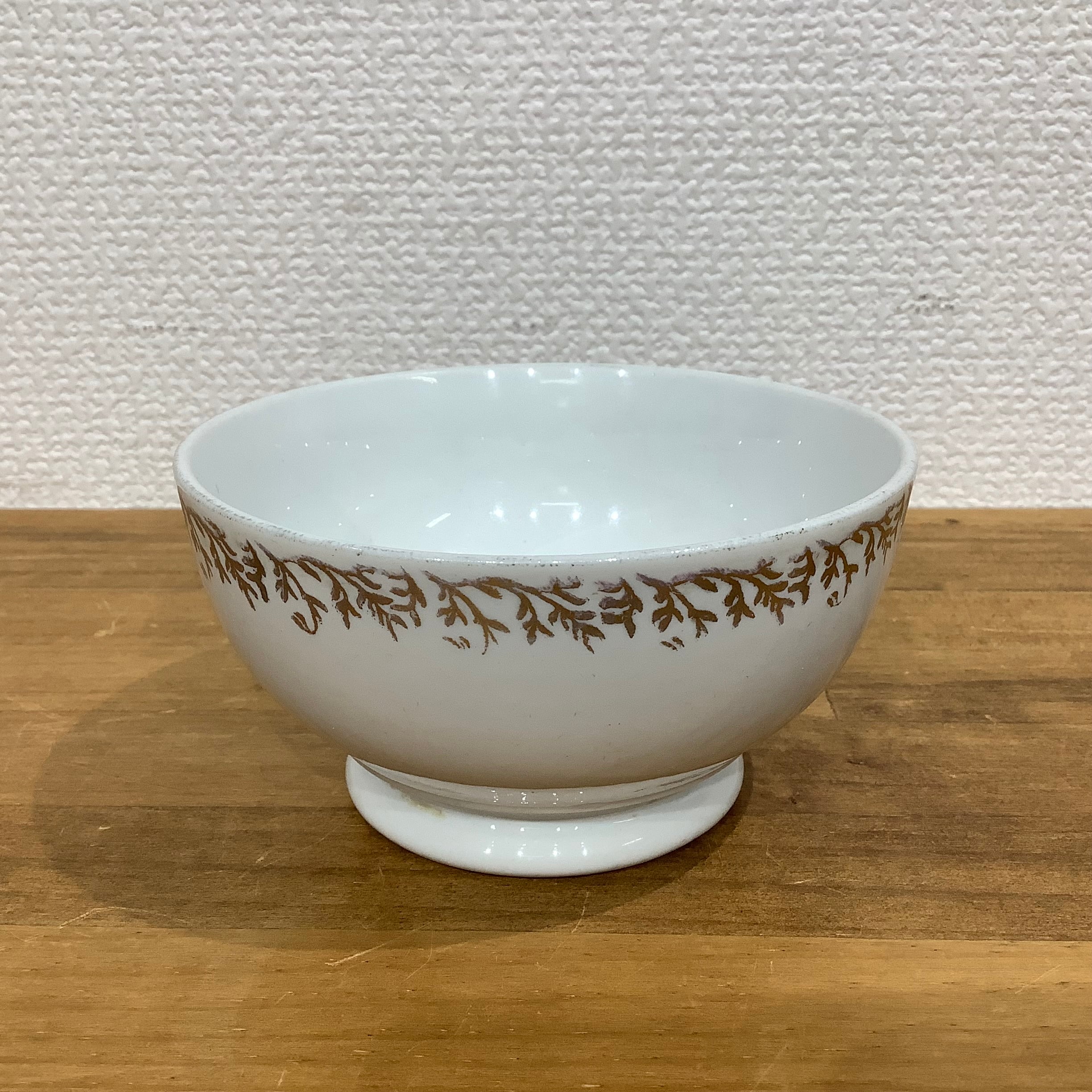 口縁に金色のラインと植物の葉模様ががプリントされているアンティークのカフェボウルです。